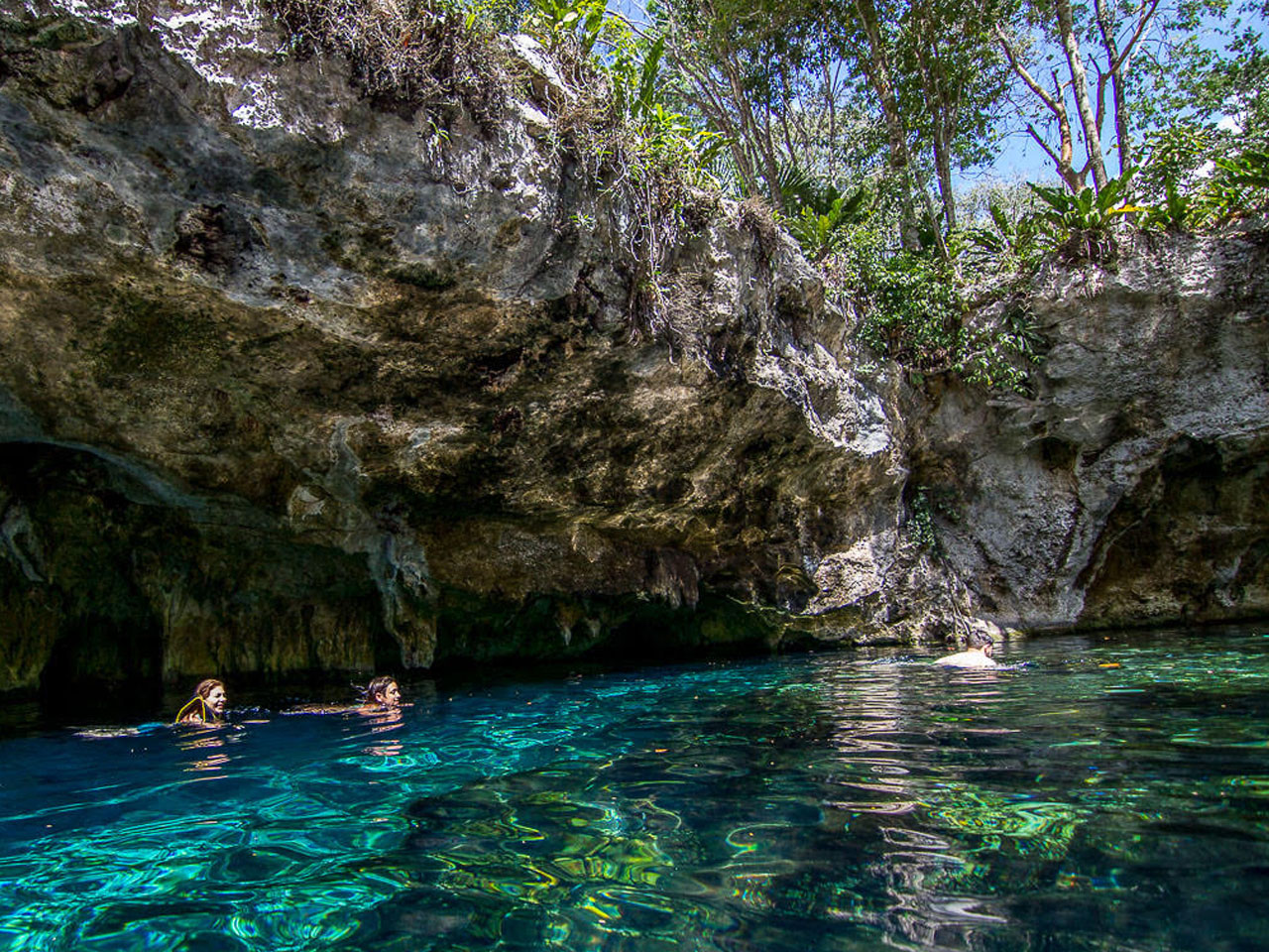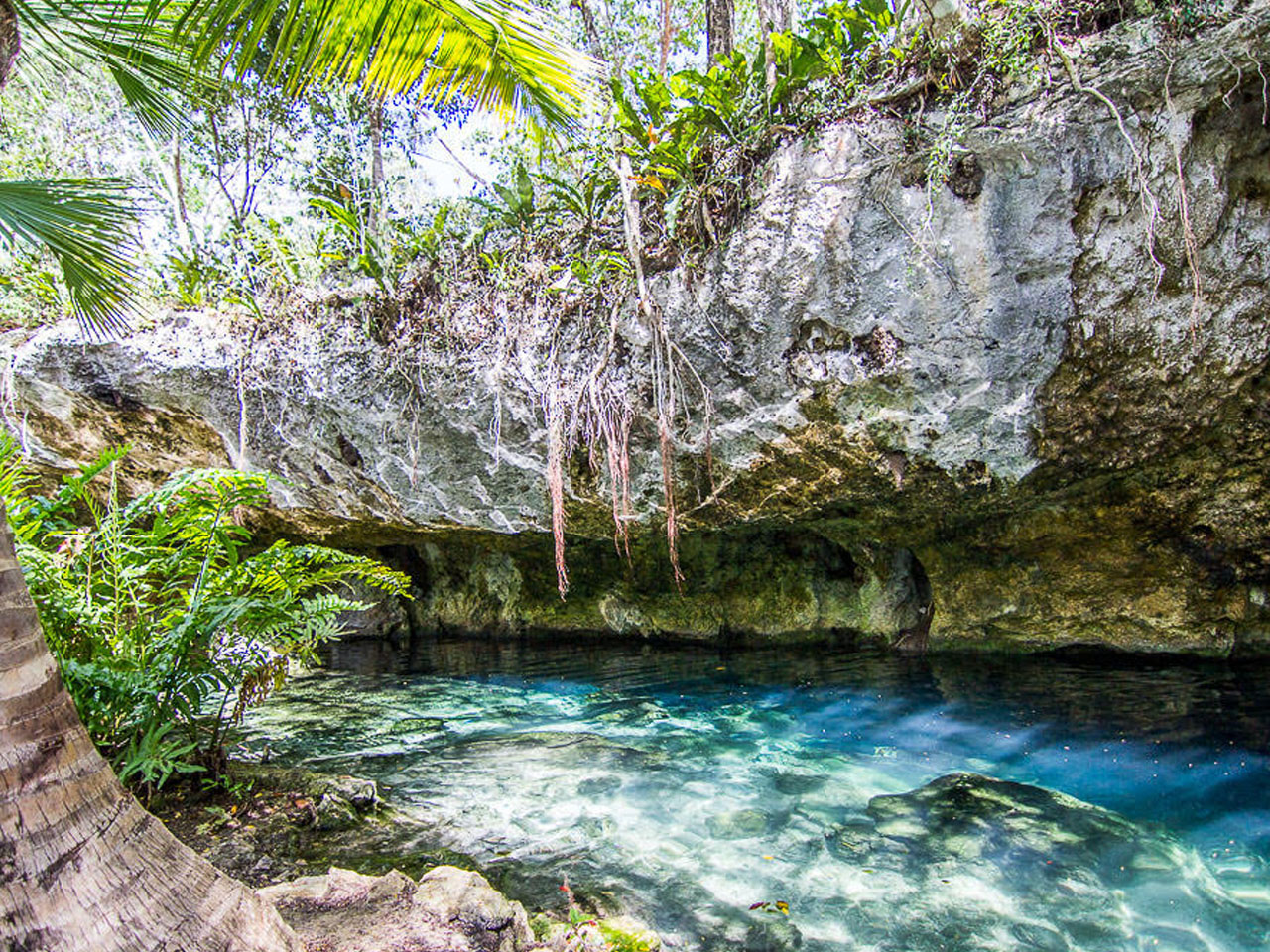 Danach geht es weiter zu einer Cenote. Cenotes sind Tropfsteinhöhlen und -grotten, die mit Süsswasser gefüllt sind. Dieses wurde durch den porösen Kalkstein, aus dem die Halbinsel Yucatan besteht, gefiltert und ist somit glasklar.